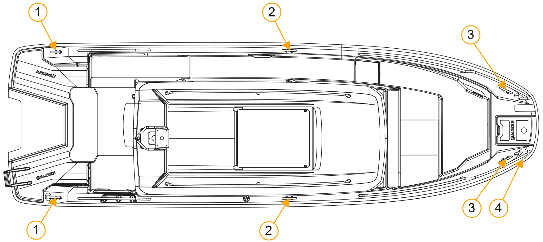 Använd endast avsedda fästpunkter för förtöjning, bogsering, ankring samt vattensporter. Se till att du har den kompetens som krävs för att hantera båten i dessa situationer.
