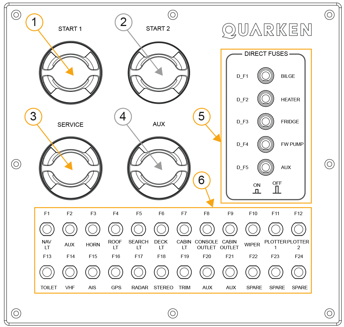 The regular fuses are connected to the devices that are powered by the service main switch. Positions F22-F24 are spare fuses for retrofits.