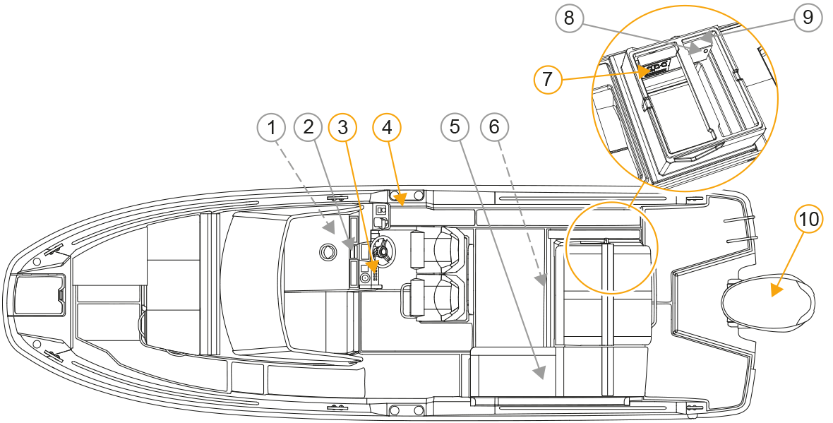 9. Suure võimsusega kaitsmed* (luugi taga diivani tüürpoordi küljel)