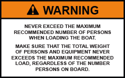 HOIATUS! Ärge kunagi ületage paati lastides maksimaalset soovitatavat inimeste arvu. Veenduge, et inimeste ja seadmete kogukaal ei ületaks kunagi maksimaalset soovitatud koormust, olenemata pardal olevate inimeste arvust. |