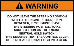 HOIATUS! Ärge lahkuge roolimiskohast, kui mootor on sisse lülitatud. Kui peate siiski roolimiskohast lahkuma, lülitage mootori neutraalasendi lüliti sisse. See tagab, et juhthoob ei lähe kogemata käigu asendisse. |