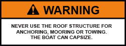 HOIATUS! Ärge kunagi kasutage katusekonstruktsiooni ankurdumiseks, sildumiseks või pukseerimiseks. Paat võib minna ümber. |