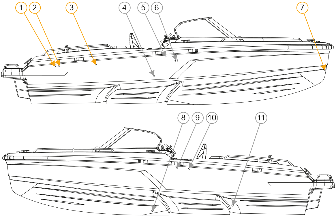 Järgmised joonised näitavad avade asukohta keres ja pealisehitistes (tekist kõrgemal).
