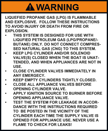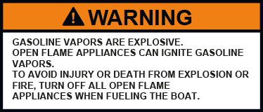 WARNING Gasoline vapours are explosive. Open flame appliances can ignite gasoline vapors. To avoid injury or death from explosion or fire, turn off all open flame appliances when fueling the boat. |