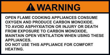 Open-flame cooking appliances consume oxygen and produce carbon monoxide. To avoid asphyxiation or injury or death from exposure to carbon monoxide, maintain open ventilation when using these appliances. Do not use this appliance for comfort heating. |