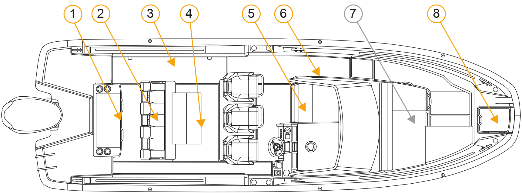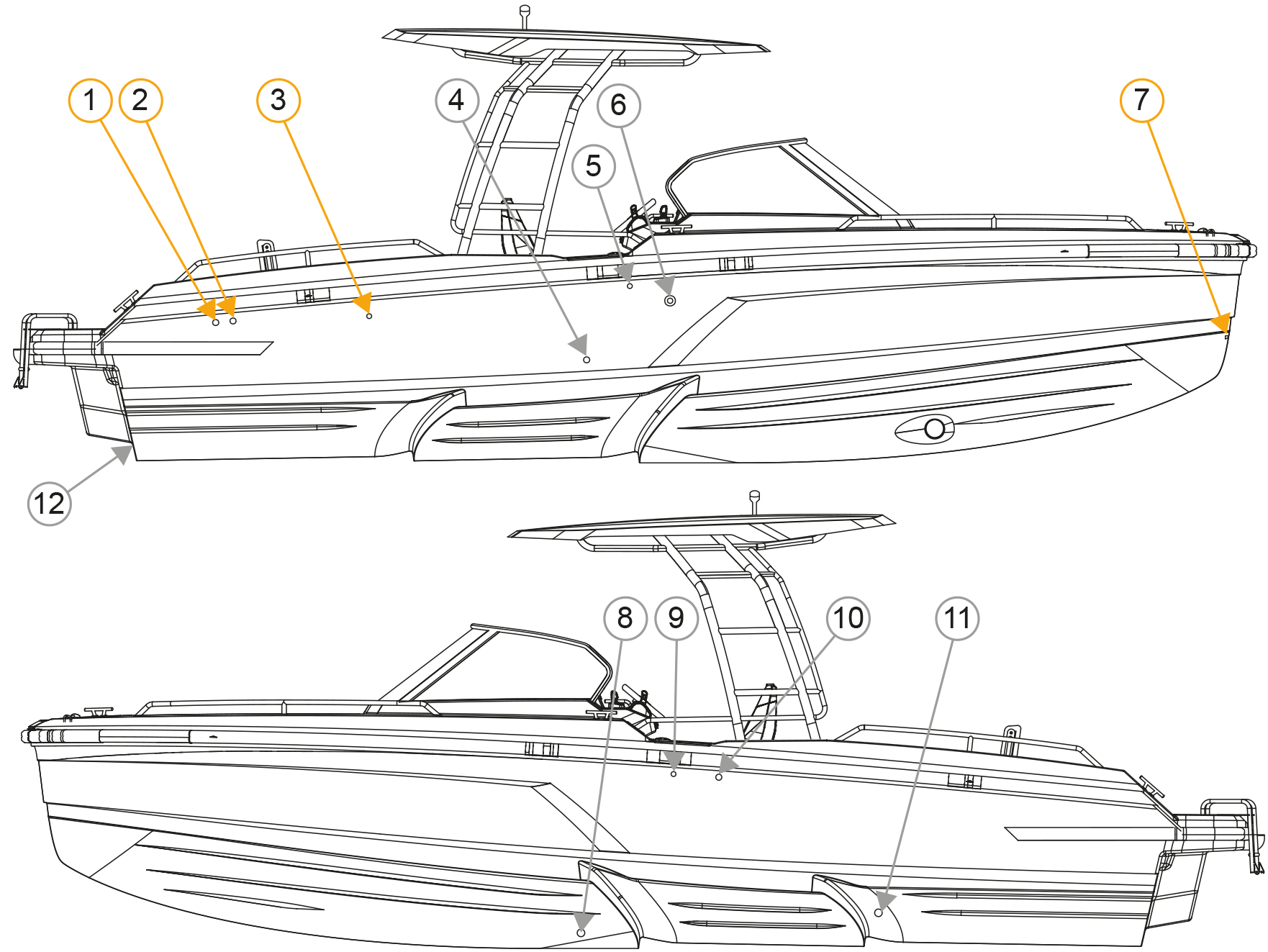 The following diagrams indicate the location of these openings in the hull and superstructures (areas above the deck).